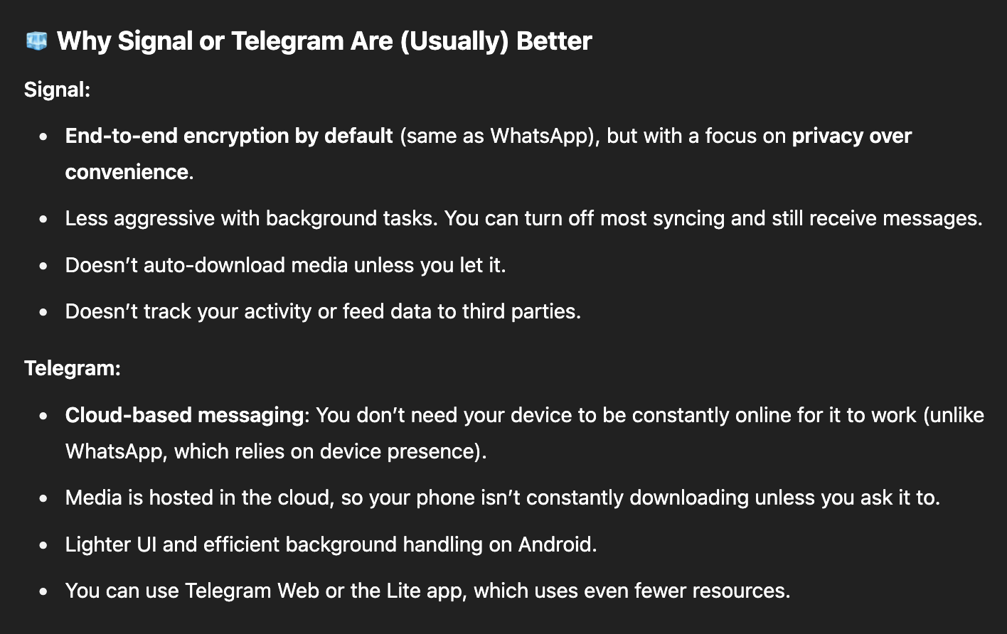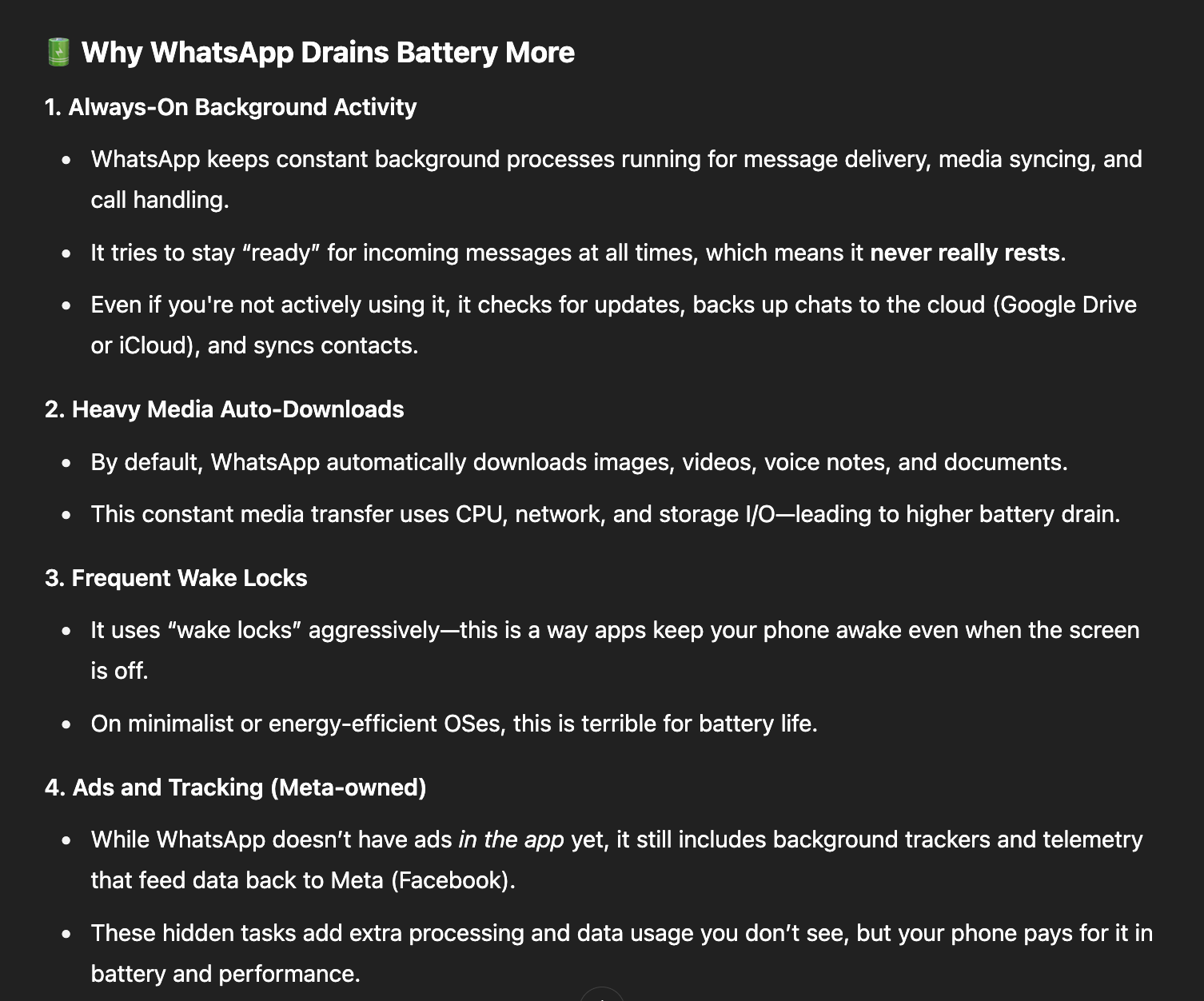 Iām considering which messenger apps, if any, Iāll sideload when my MK is with me. It seems whatsapp is just a bigger drain than most, by default. I also looked into Beeperās battery drain (because boy, wouldnāt that be convenient if it was battery efficient and all messages could be consolidated) but it seems Beeper may be worse than whatsapp, since it syncs all messages and bridges to other services via their servers. It requires a persistent internet connection apparently (this is all from chatgpt).