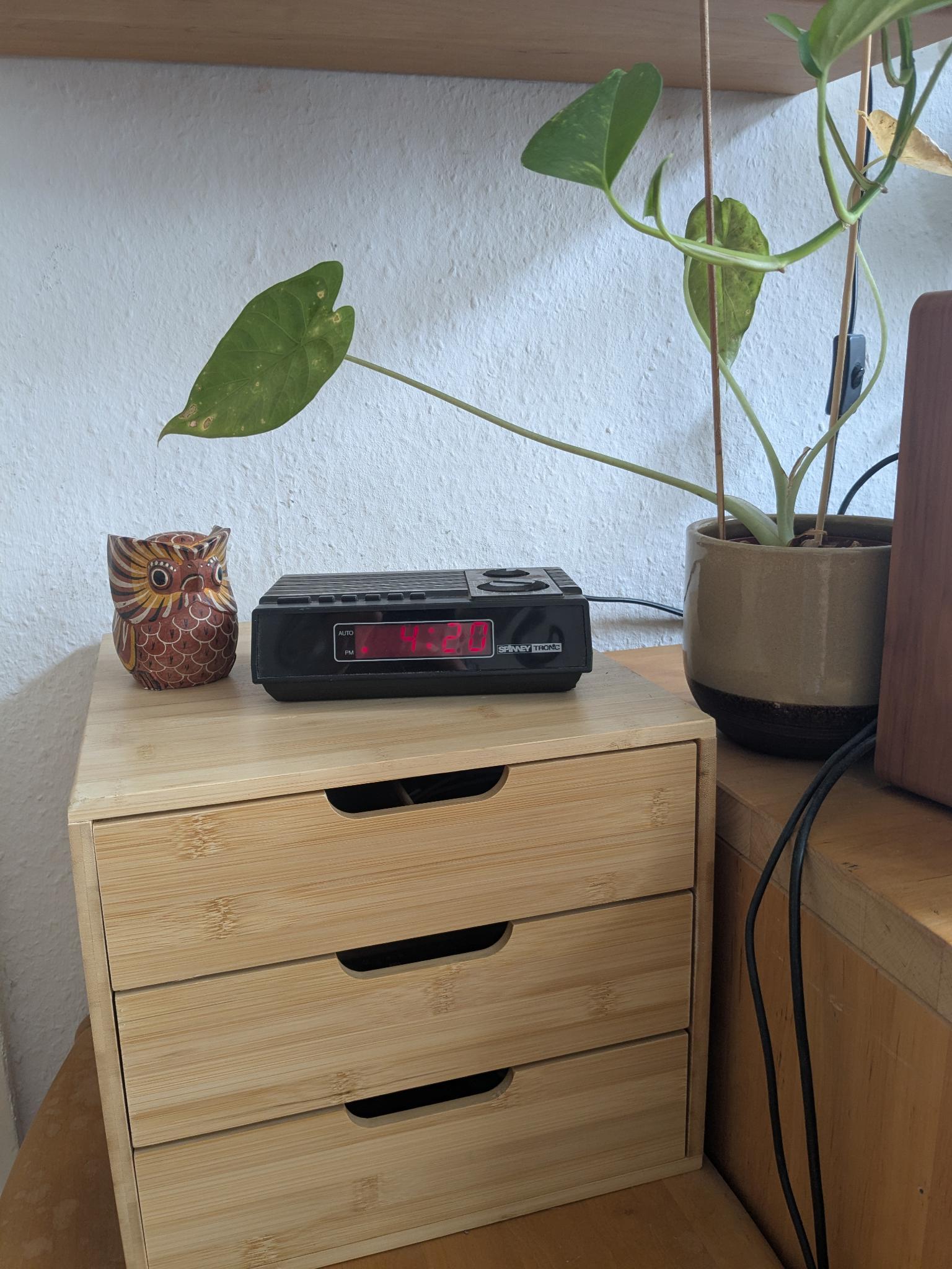 - a bunch of old seven-segment display alarm clocks I bought for a few bugs on ebay and placed in every room so I never have to pick up my phone to check the time
