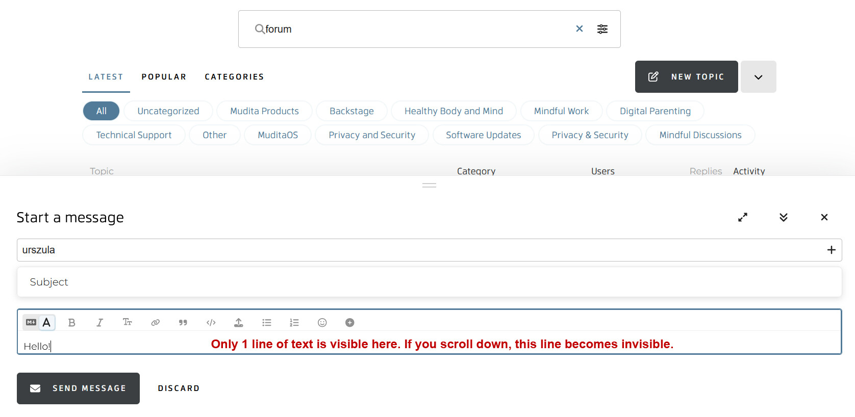While the forum obviously was fixed so the text box no longer hides the “Send” button, when writing a private message the text box now only shows 1 line of text, and if you scroll up or down, that line disappears and shows the next line. While this does not make posting impossible like the earlier issue did, it sure makes proof-reading a message difficult.
