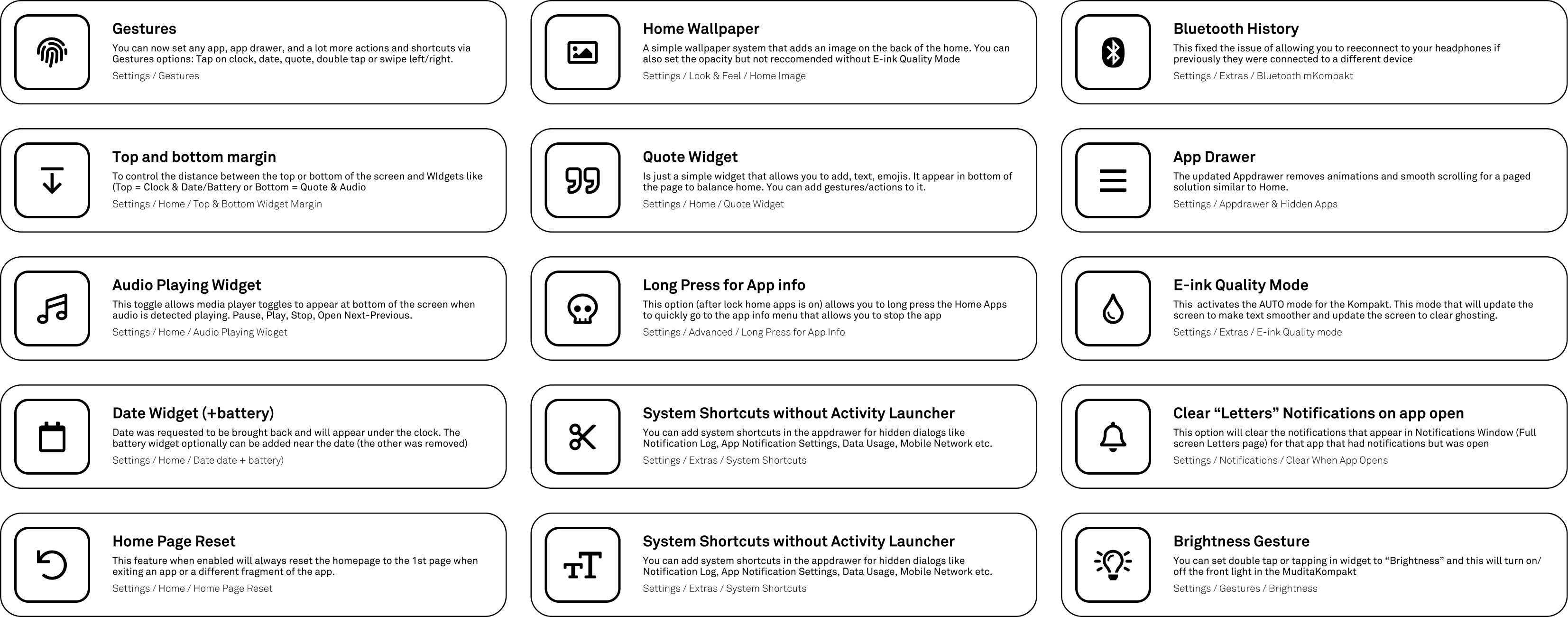 Some features like actions (Lock screen, power dialog won’t work due to the lack of accessibility permission in v1.2.0 Mudita OS K).