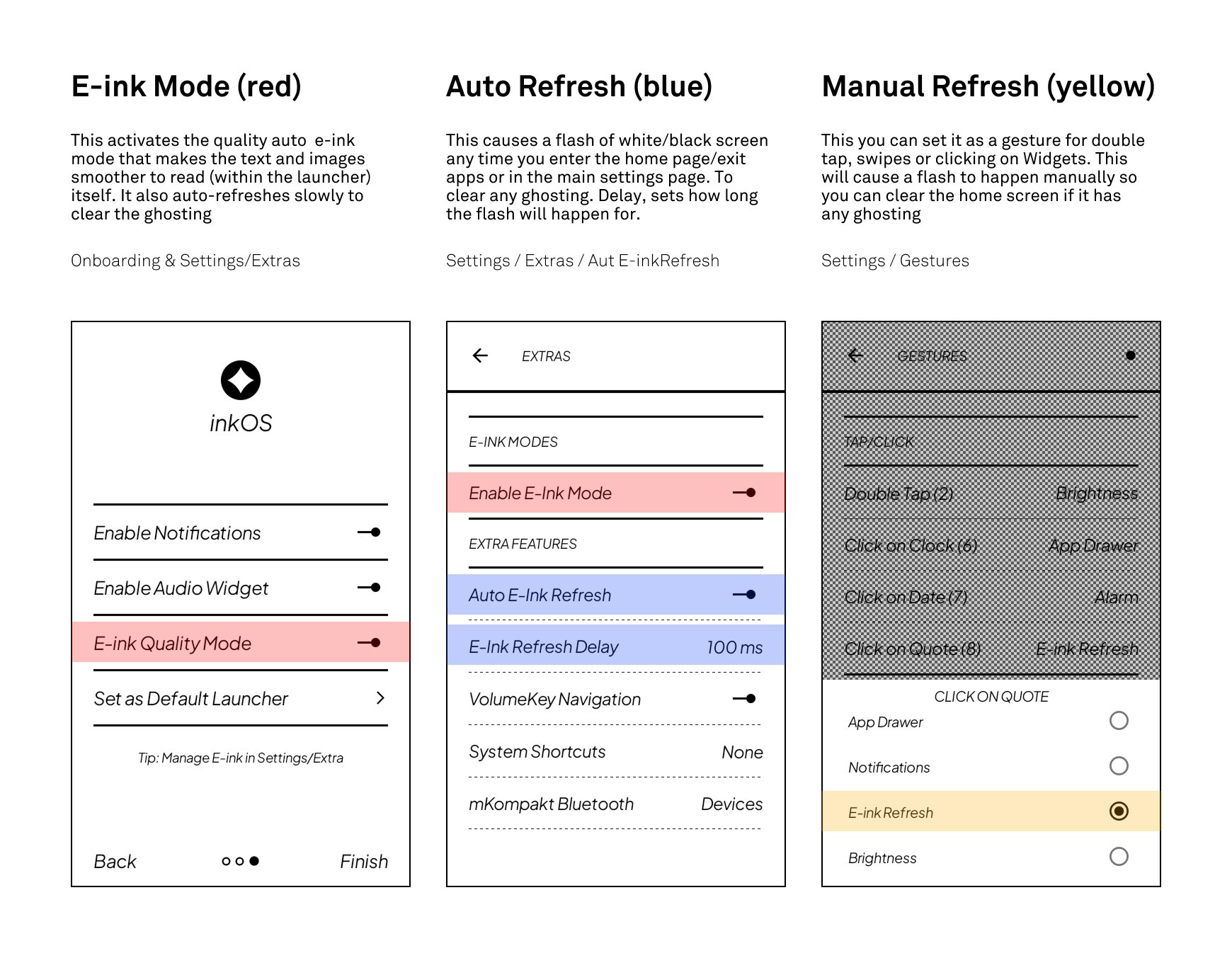 I noticed a mistake of not naming a string the same, so wanted to clarify the e-ink options for users to avoid confusion. Red is the same option, blue are related to each other and yellow is the manual refresh option.