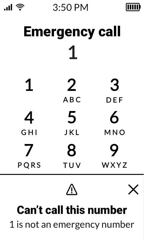Assuming for this example that you saved “1” as your new Call in case of emergency value, here is what you will get when the [Emergency] pushbutton accidentally gets tapped (e.g., through one’s pocket):