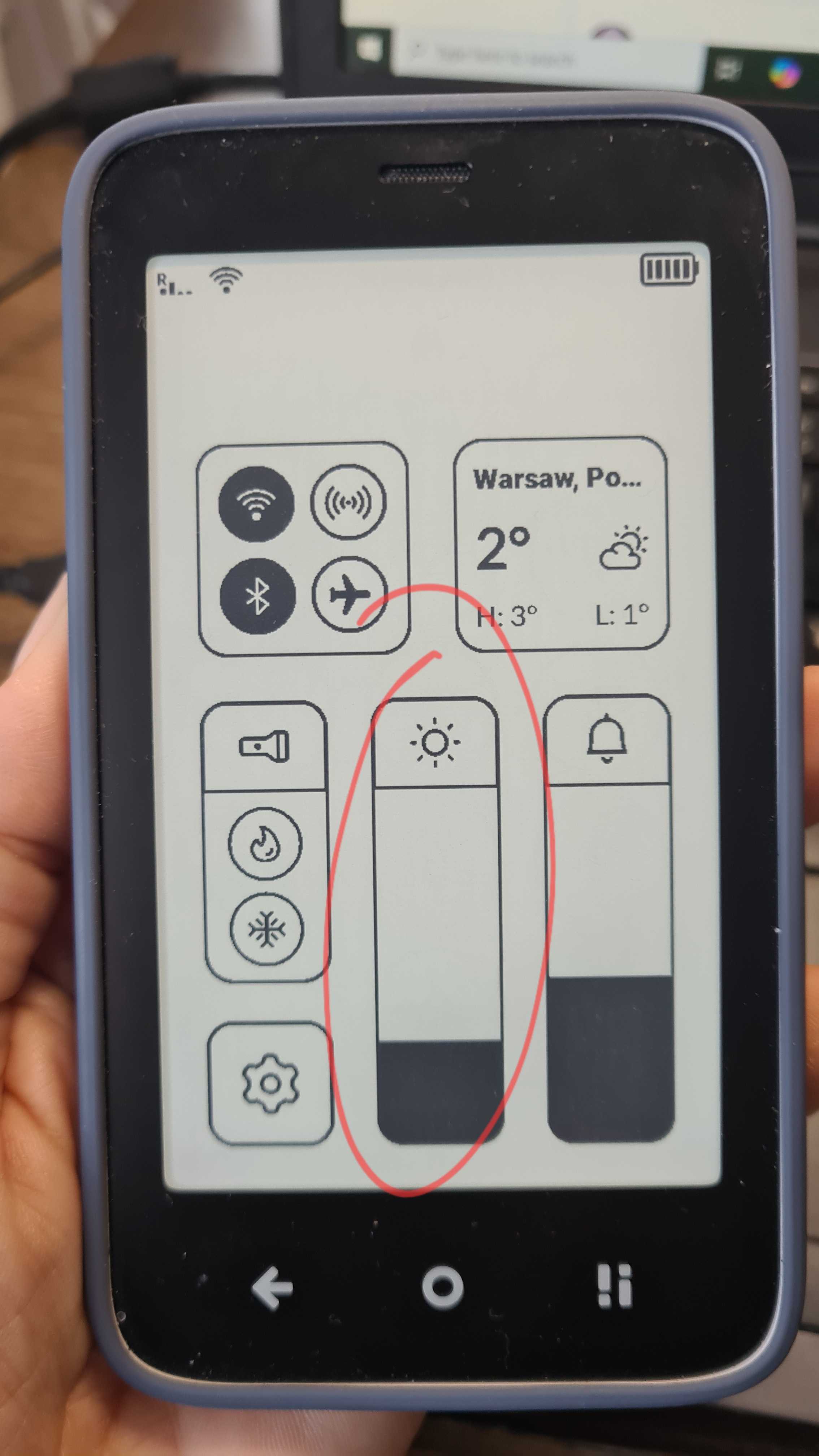The only physical button/switch is the Offline+ slider. Perhaps Mudita could use the toggling of that slider to activate the backlight for a few seconds?