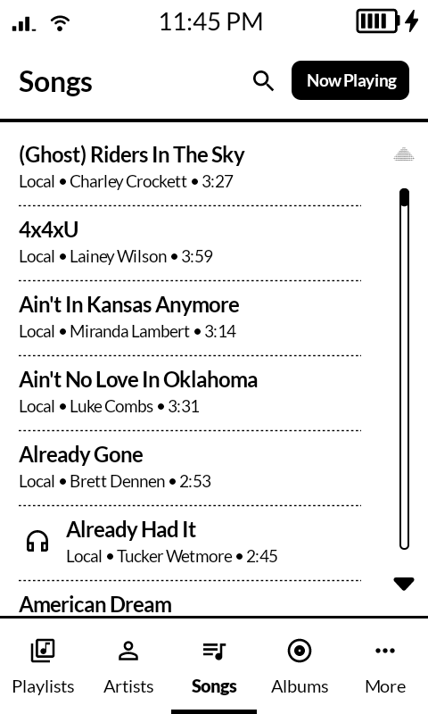 Here’s some updated screenshots. All of these screens were updated in my most recent changes. You can see the updated album view now shows track numbers (if it exists in meta data) and orders by them. I also show playlist functionality (except the add ability because I forgot to grab that but it just shows the songs with checkboxes similar to the built-in app.)